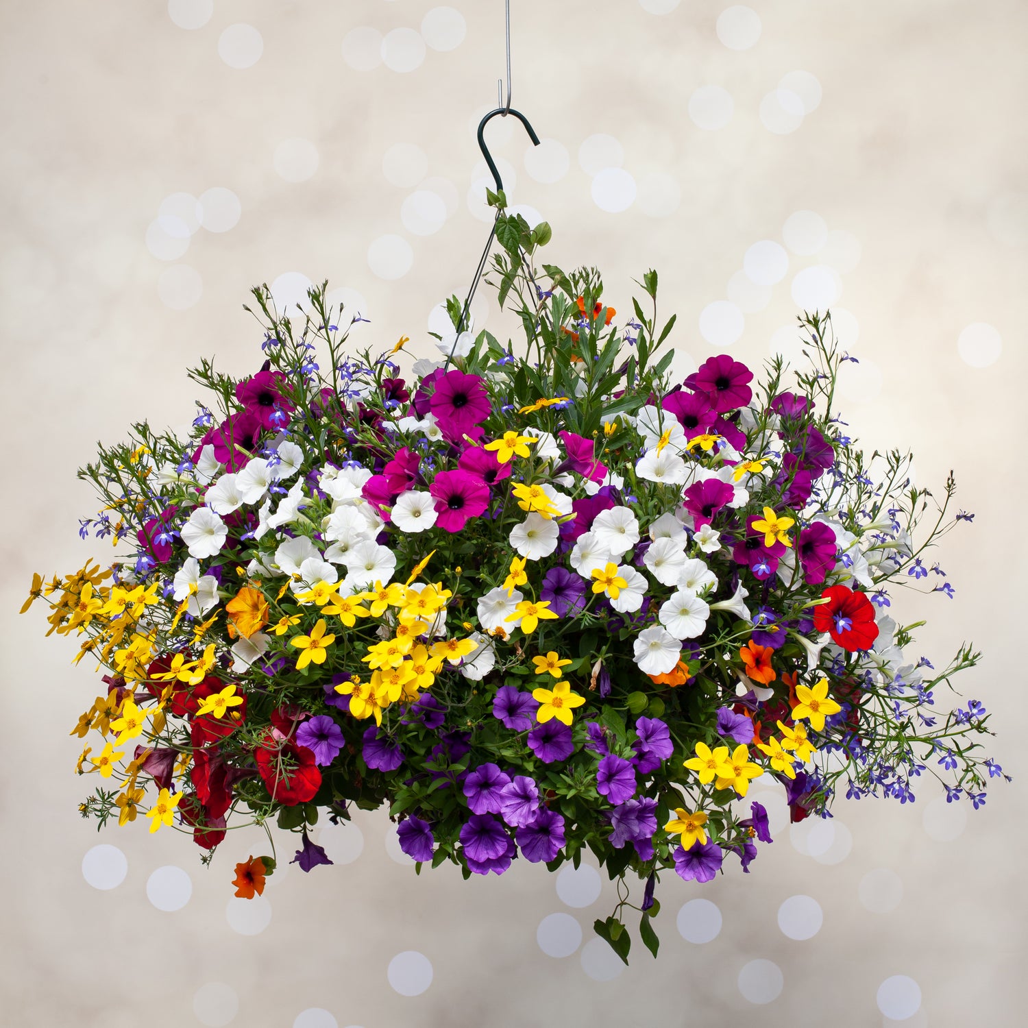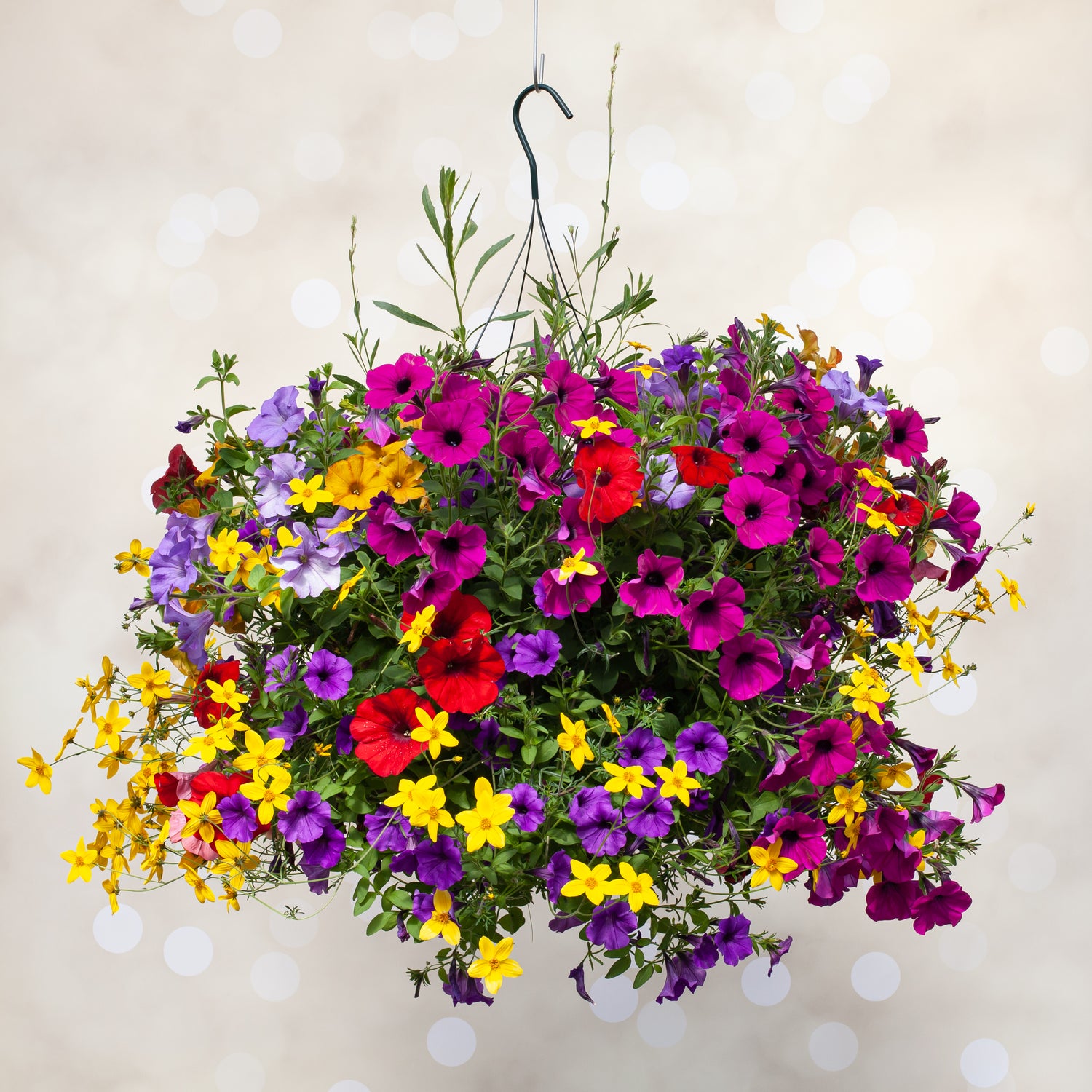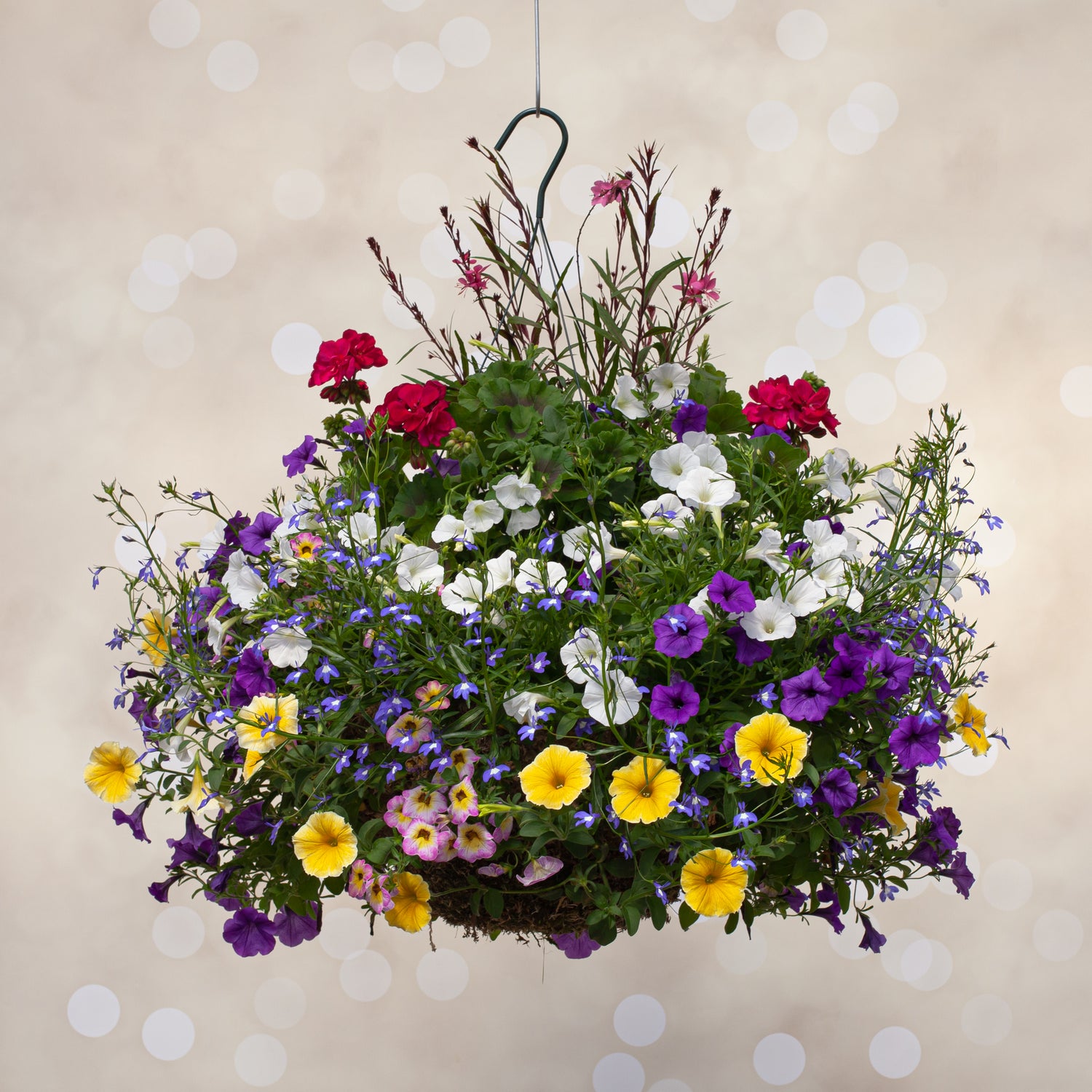 The Summer Breeze sun basket boasts cascading white, blue, and purple petunias, adorned with pops of vibrant oranges and reds. Adding to its charm, delicate Thunbergia gracefully crawls up the basket, creating a picturesque display that captures the essence of a warm summer day.
