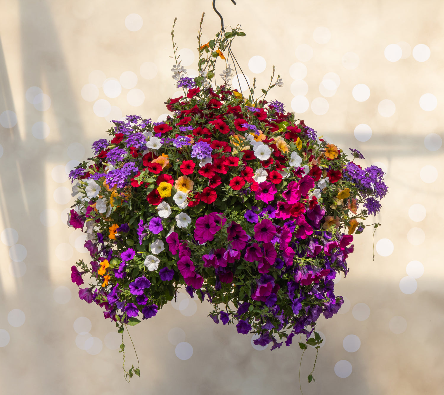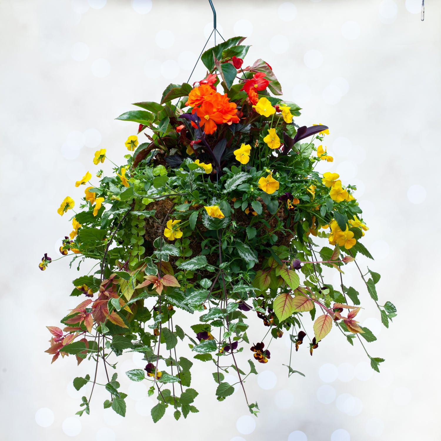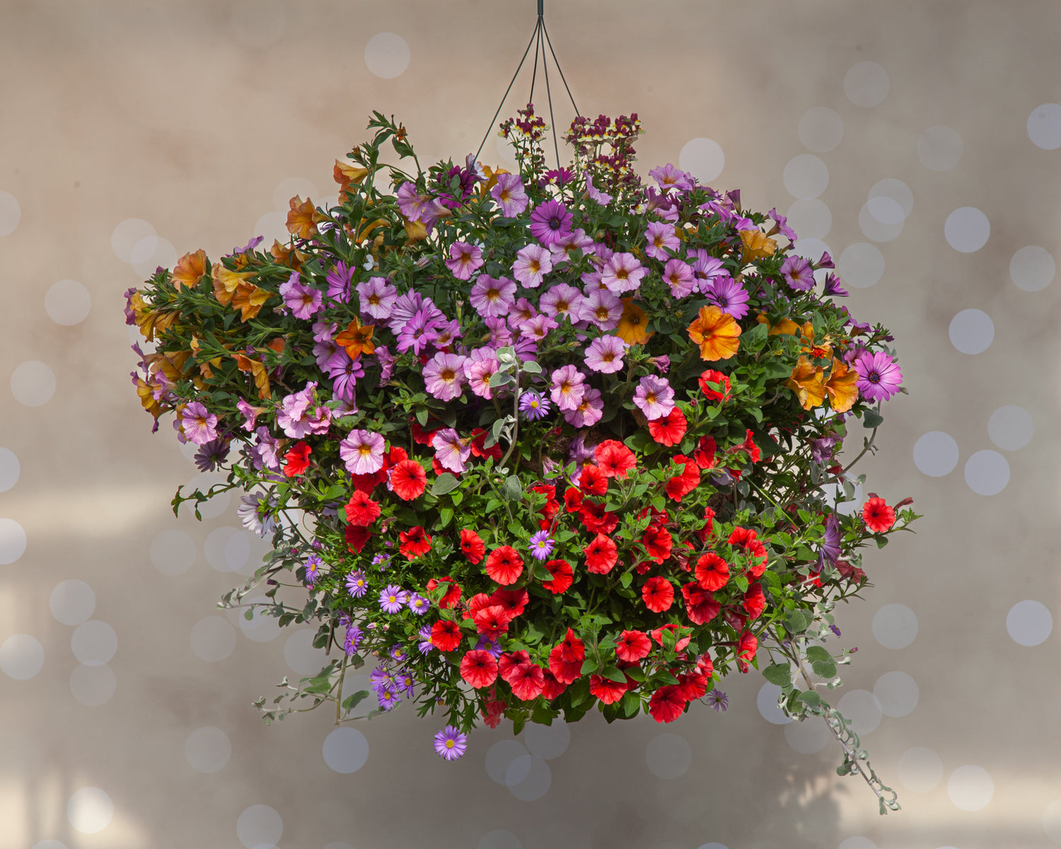 A glowing mix of sunset-inspired petunias in rich purple, fiery orange, and soft red creates a warm, eye catching display. Cascading licorice adds soft greenery, while airy nemesia with pops of daisy-like charms add softness to this arrangement. Perfect for part shade, this basket shines with color all season long.