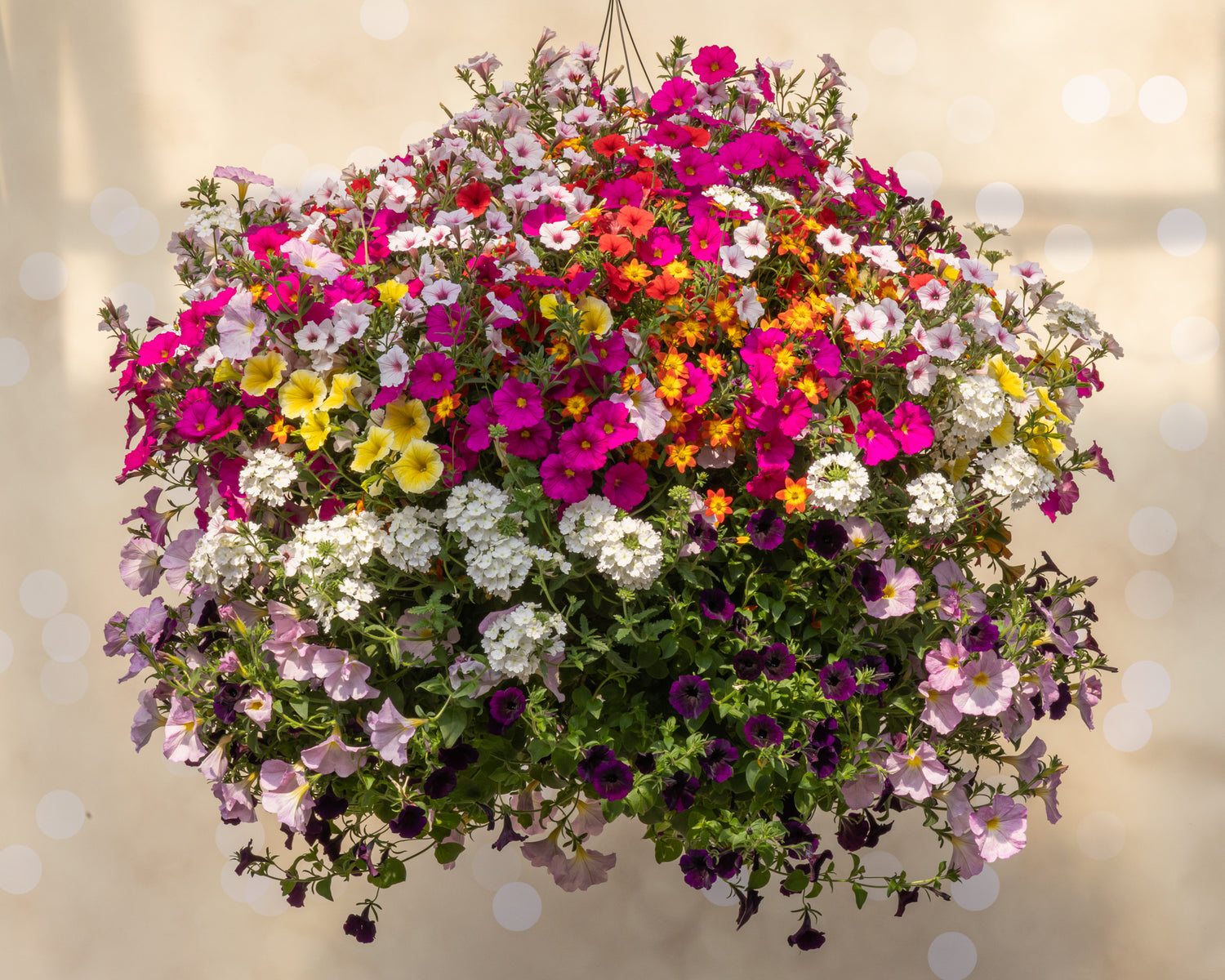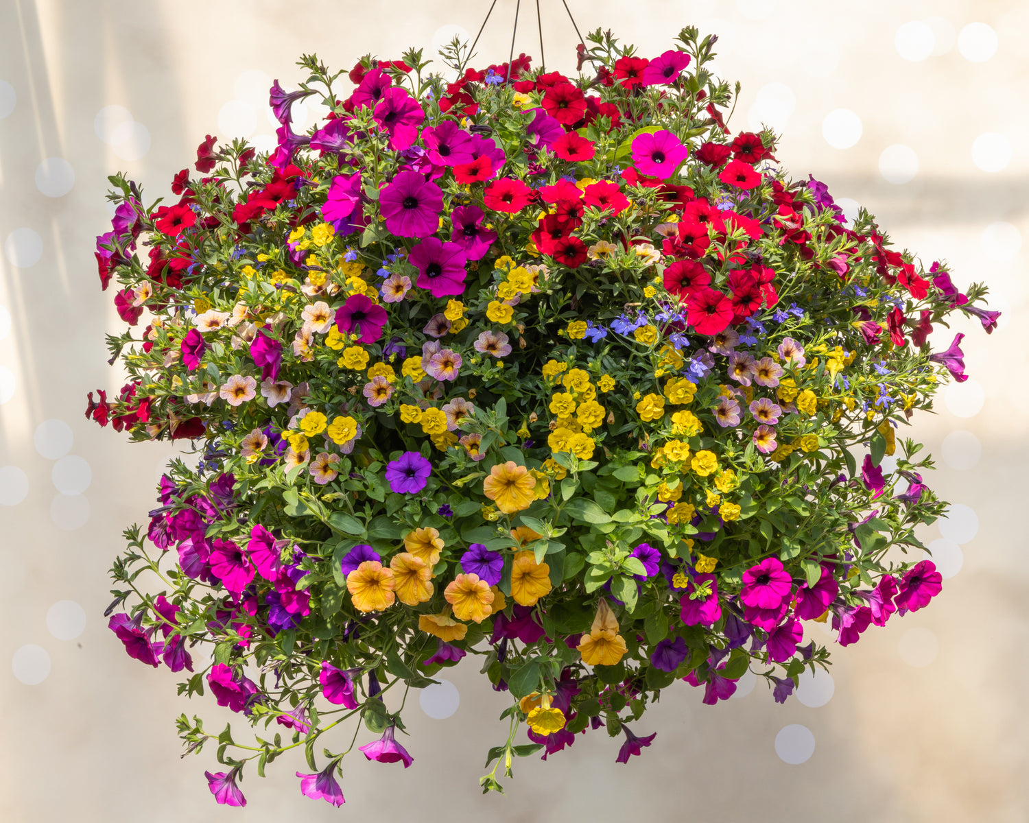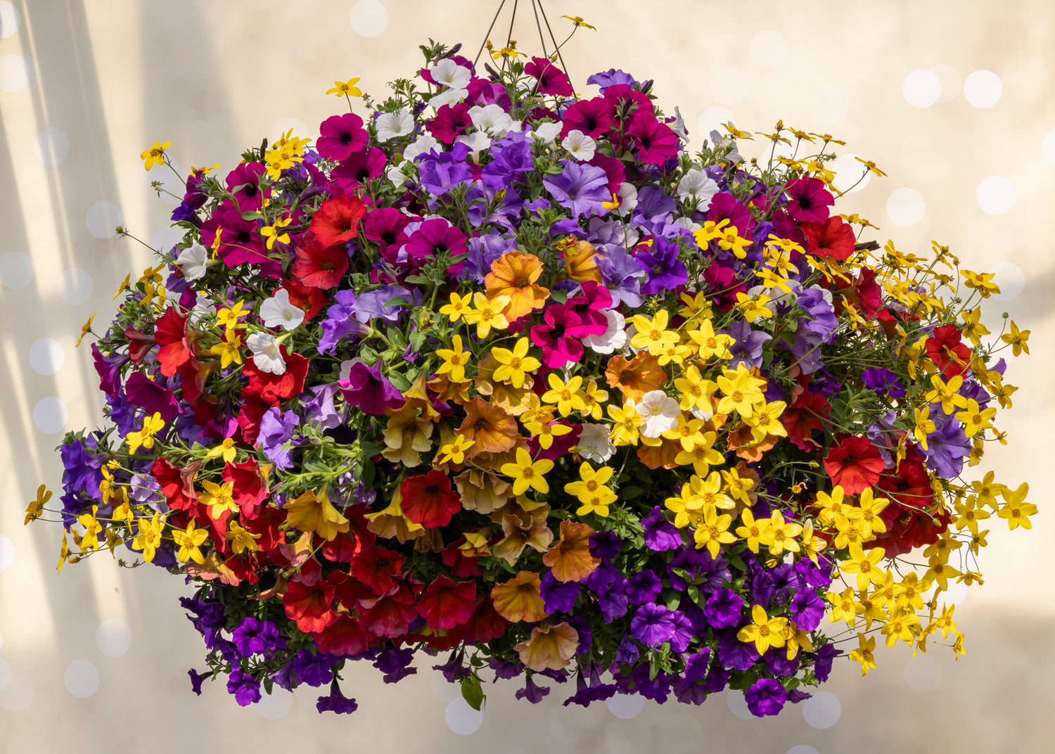 A glowing mix of sunset-inspired petunias in rich purple, fiery orange, and soft red creates a warm, eye catching display. Cascading licorice adds soft greenery, while airy nemesia with pops of daisy-like charms add softness to this arrangement. Perfect for part shade, this basket shines with color all season long.