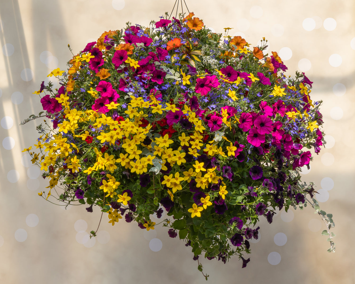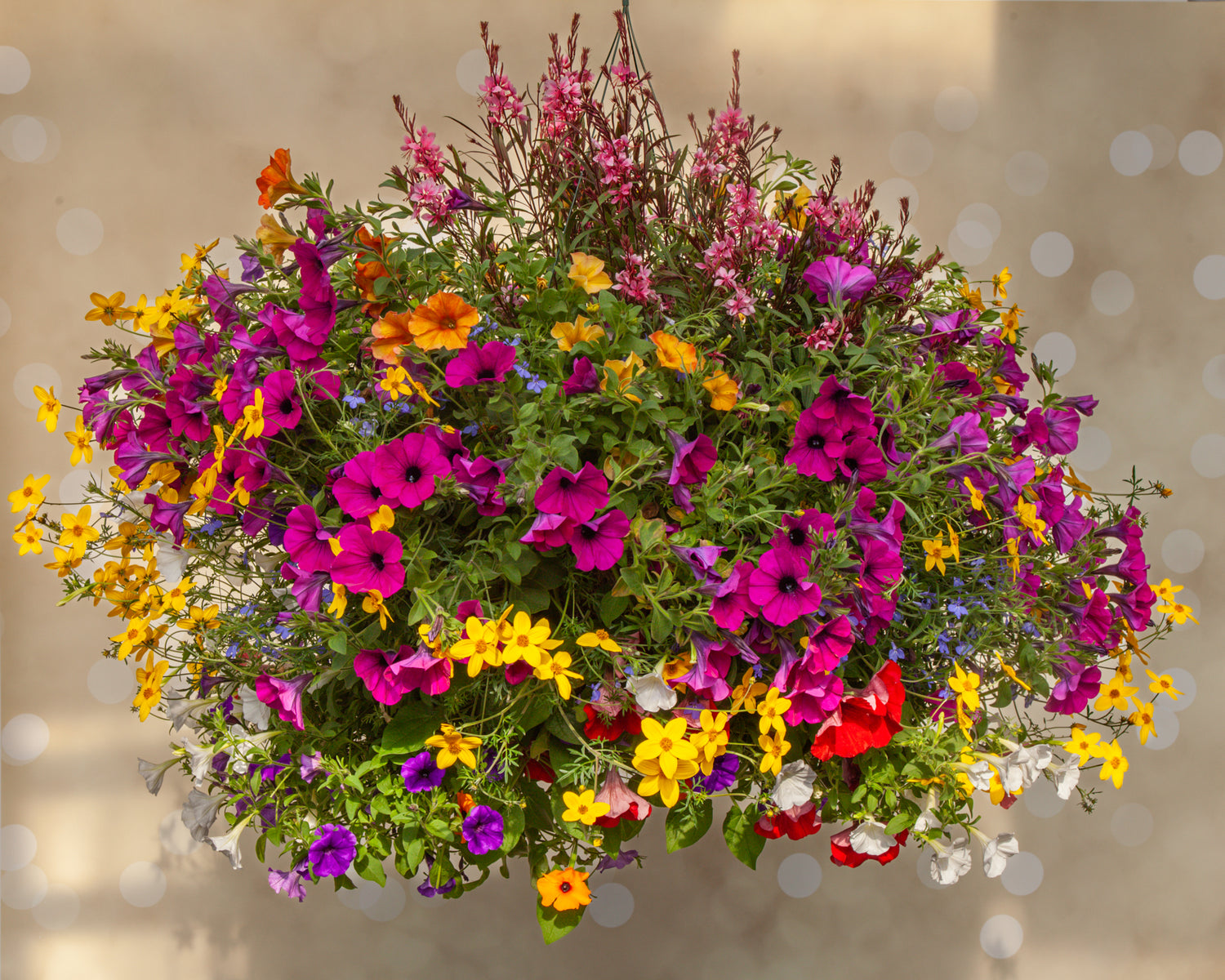 The Color Burst sun basket features vibrant Guara spikes complemented by cascading petunias, verbena, and biden’s in a harmonious blend of contrasting warm and cool colors, creating a stunning visual display.