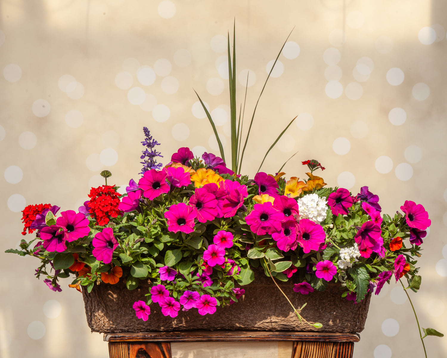 Vibrant and playful, Sherbet Splash features a lively mix of orange, pink, purple, and red petunias, topped with bold hot pink gaura. Sparkling star-like flowers and lobelia with hints of blue add contrast and whimsy. This full sun arrangement is a cheerful burst of color and energy to any space.