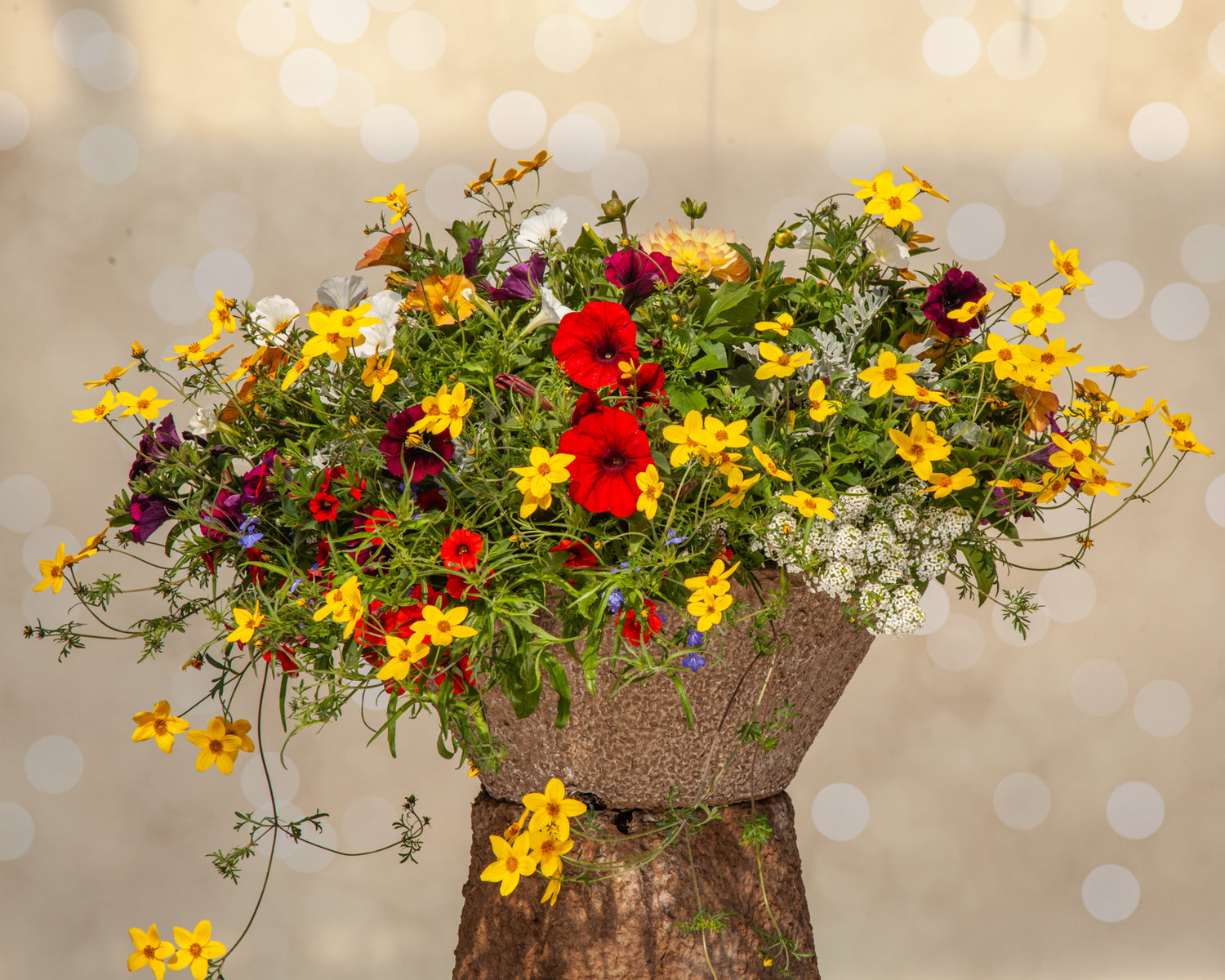 Velvet Flare is inspired by the rich tones of a fading sunset. Waves of pink, deep velvet purple, and vibrant orange petunias blend together in dramatic contrast. Soft trails of licorice vine add gentle texture and movement. Bright yellow bidens sparkle like tiny stars throughout the display, complemented by subtle hints of blue and white for added depth and balance. Finished with a striking SunPatients centerpiece, this part-shade beauty offers long-lasting color in a semi critter resistant combination most animals tend to avoid.